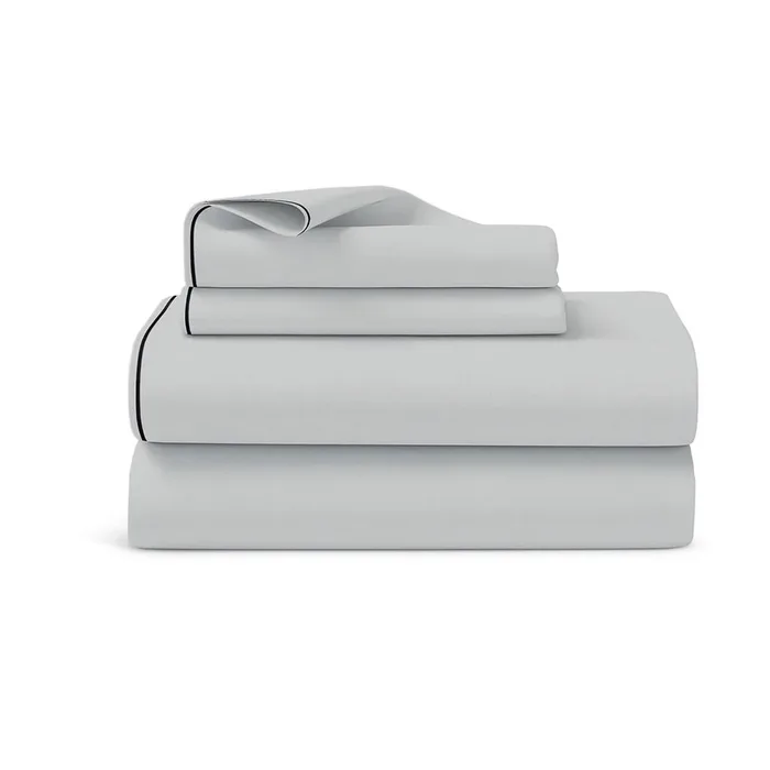 סט מצעים יוקרתי באריגת סאטן איכותית עם סיומת פייפינג אלגנטית, בצבע אפור בהיר שמשדר יוקרה ופינוק בכל פרט.