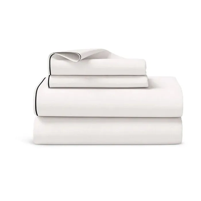 סט מצעים יוקרתי באריגת סאטן איכותית עם סיומת פייפינג אלגנטית, בצבע לבן שמשדר יוקרה ופינוק בכל פרט.