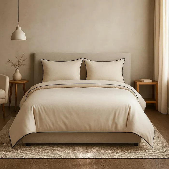 סט מצעים יוקרתי באריגת סאטן איכותית עם סיומת פייפינג אלגנטית, בצבע מוקה שמשדר יוקרה ופינוק בכל פרט.