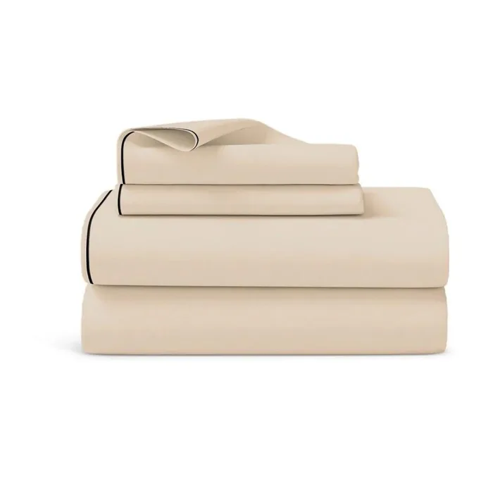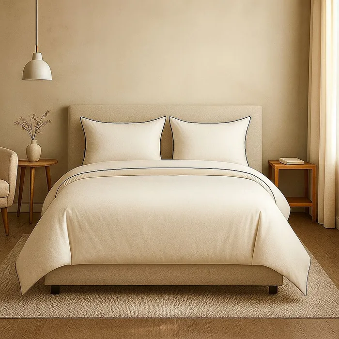 סט מצעים יוקרתי באריגת סאטן איכותית עם סיומת פייפינג אלגנטית, בצבע שמנת שמשדר יוקרה ופינוק בכל פרט.